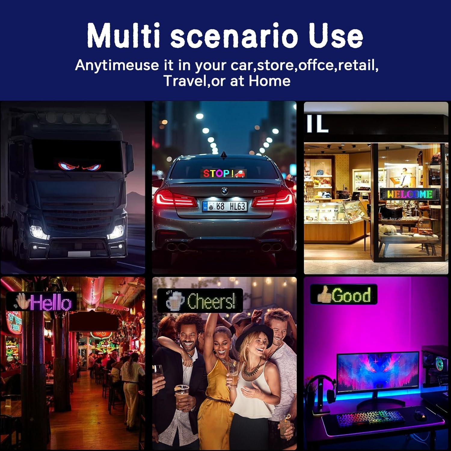 • Multiple Usage Scenarios:This scrolling LED sign for car works everywhere: show business ads, display car light signs, celebrate holidays with animations, or warn drivers near schools. Perfect for stores, drivers, and event planners