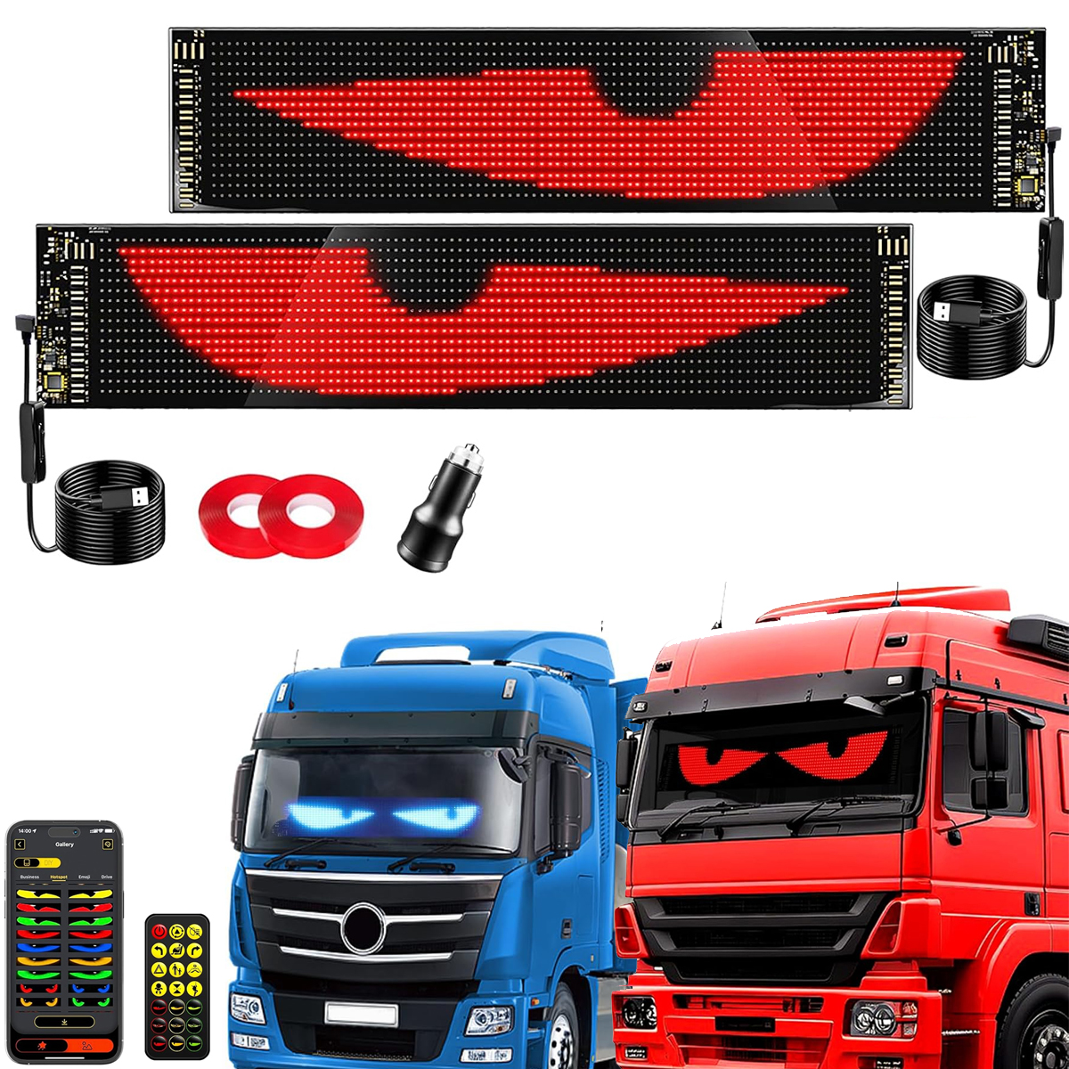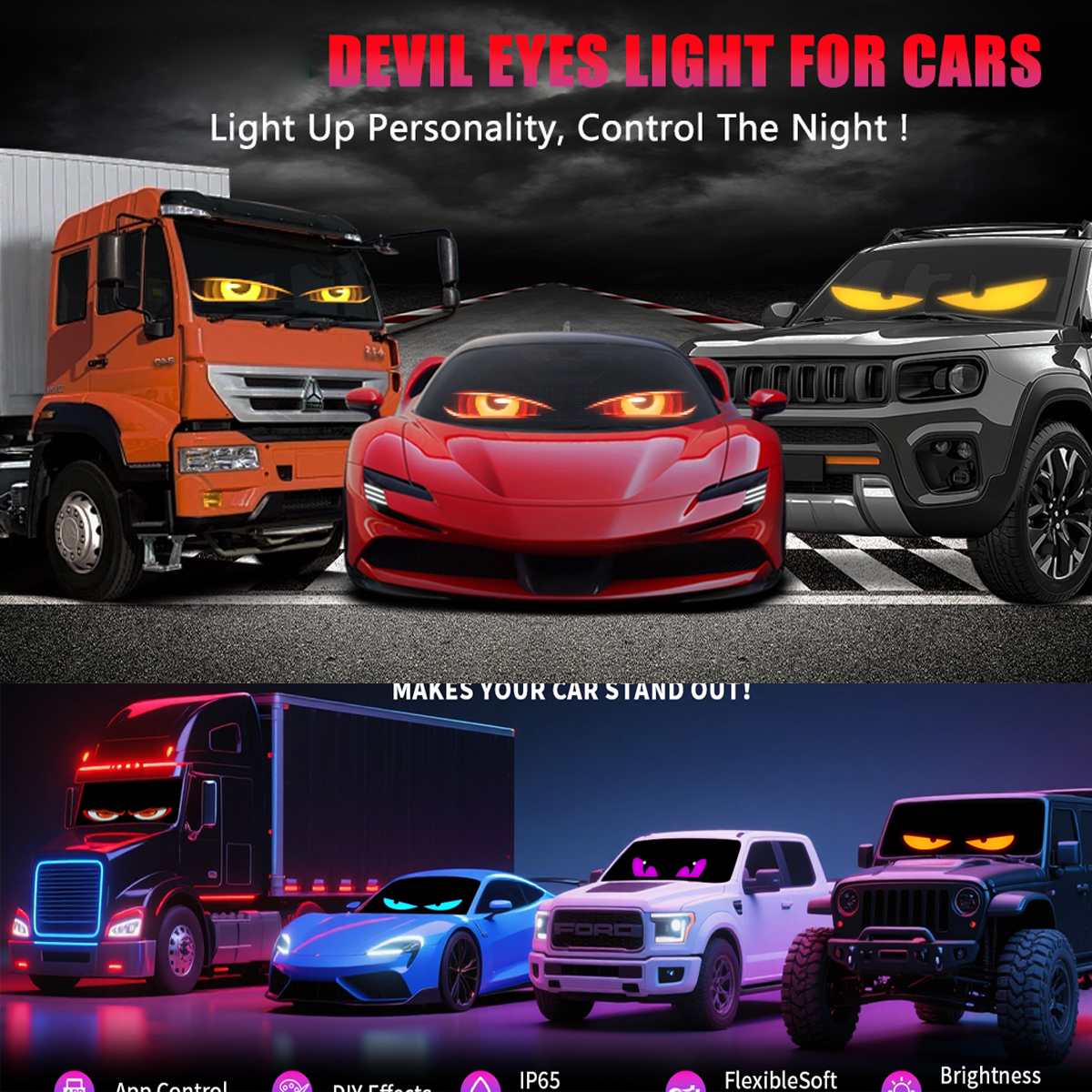 - Devil Eyes : High-brightness (1,500+ LEDs) panels with app-controlled animations, compatible with trucks and cars.