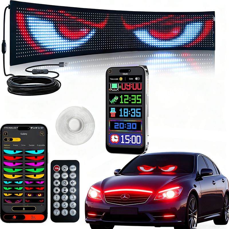 - Programmable LED Eyes for Cars & Trucks – Transform your vehicle with dynamic devil eyes, scrolling text, and custom animations via free iOS/Android/Google Play app. Featuring waterproof adhesive coating and ultra-bright LEDs, these ojos led para carro kits bend seamlessly on curved windshields. Includes 13ft USB-C cable for car chargers/power banks – perfect for trucks, SUVs, parties, and storefront displays.