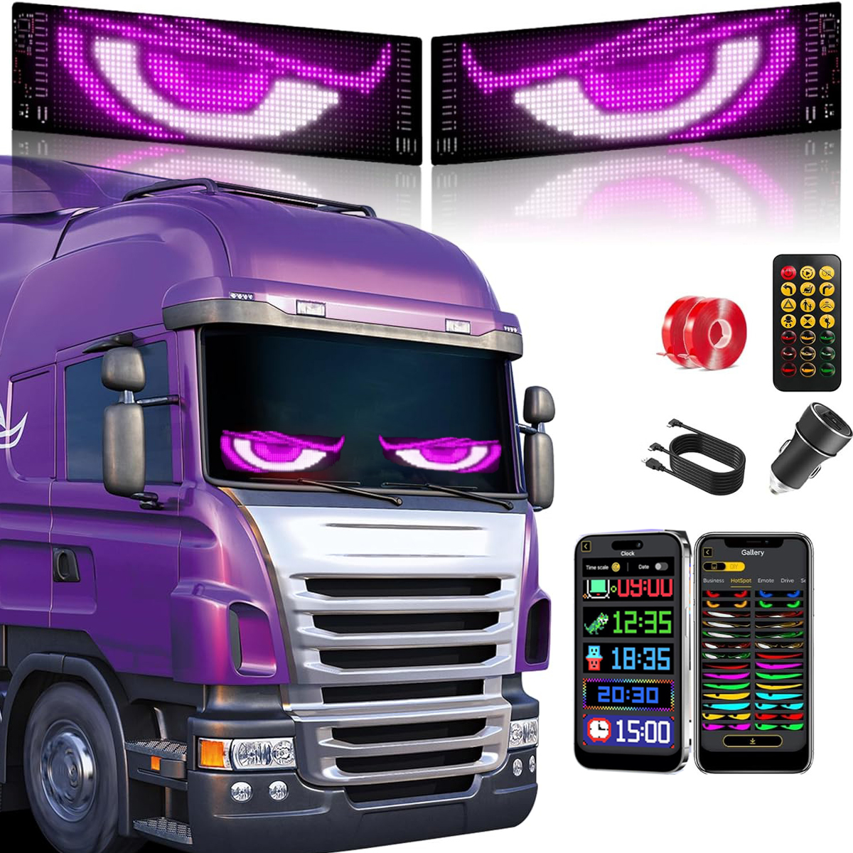 | Included Components | 3M Double Faced Adhesive Tape, 4.5M USB Cable, Mobile App Controller, Windshield Eyes Animated LED for Truck3M Double Faced Adhesive Tape, 4.5M USB Cable, Mobile App Controller, Windshield Eyes Animated LED for Truck |